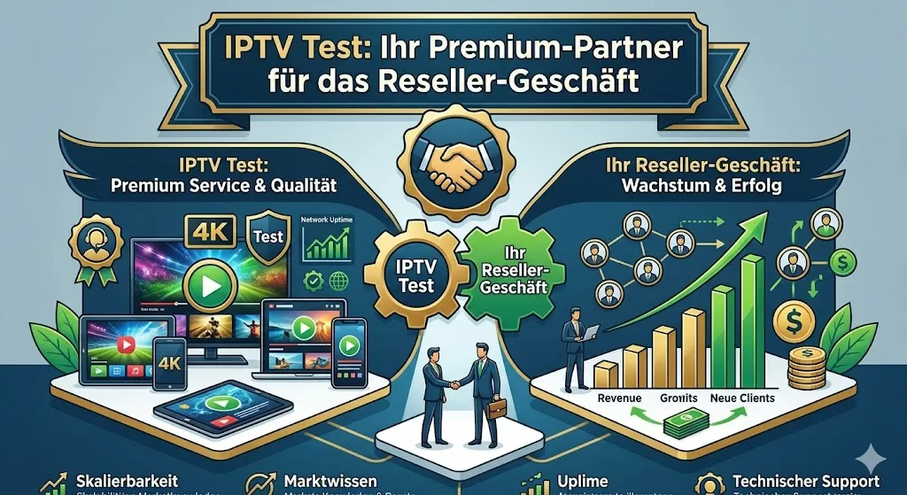 Wenn Sie in diesem dynamischen Markt langfristig Fuß fassen wollen, benötigen Sie einen starken und verlässlichen Hauptanbieter im Hintergrund. IPTV Test bietet ein herausragendes und hochprofitables Partnerprogramm an. Besuchen Sie direkt IPTV Test Reseller, um alle Details zu den attraktiven Konditionen zu erfahren.